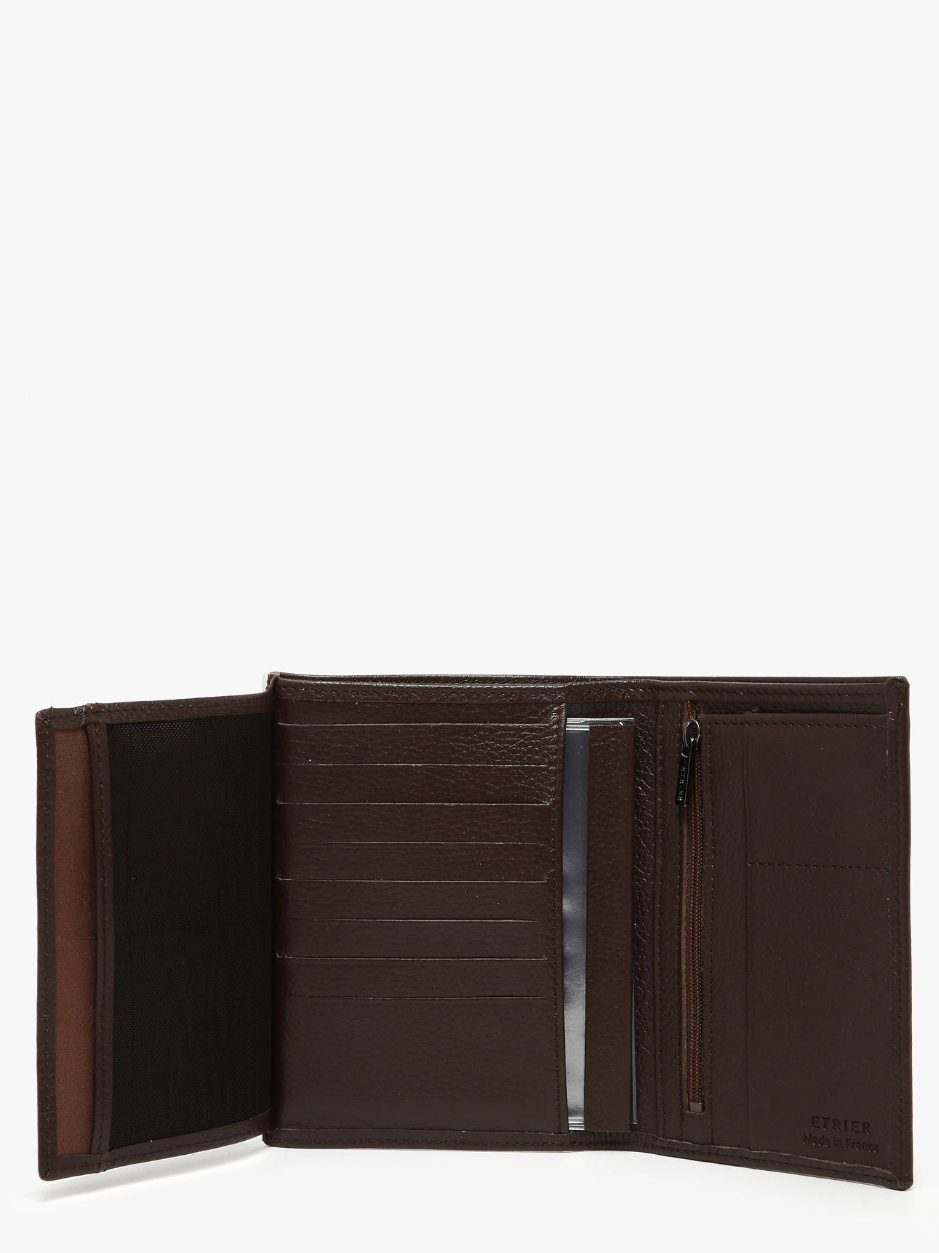 Le portefeuille en cuir Madras par ETRIER se distingue par son design pratique et élégant. À l'arrière, une poche ouverte pour billets couvre toute la longueur. Lorsqu'il est déplié, la face gauche présente une poche filet couvrant toute la surface. Au dos, on trouve deux fentes verticales en plastique transparent pour cartes et une grande fente verticale sur toute la hauteur. En bas à gauche, un drapeau français cousu souligne son authenticité. La face du milieu dispose de huit fentes horizontales pour cartes bancaires, accompagnées d'une grande ouverture verticale avec une protection plastique pour un permis 9x13 cm à l’intérieur. La face droite comprend une grande ouverture verticale, une poche zippée verticale sur toute la hauteur, ainsi que deux poches ouvertes verticales. En bas à droite, le logo ETRIER en métal et la mention Made in France, embossés ton sur ton, ajoutent une touche de raffinement. Ce portefeuille, conçu et fabriqué en France, incarne le savoir-faire artisanal et l'authenticité du produit.